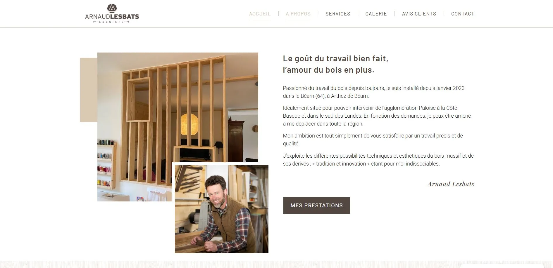 Conception du site vitrine « one-page » de Arnaud Lesbats, ébéniste.